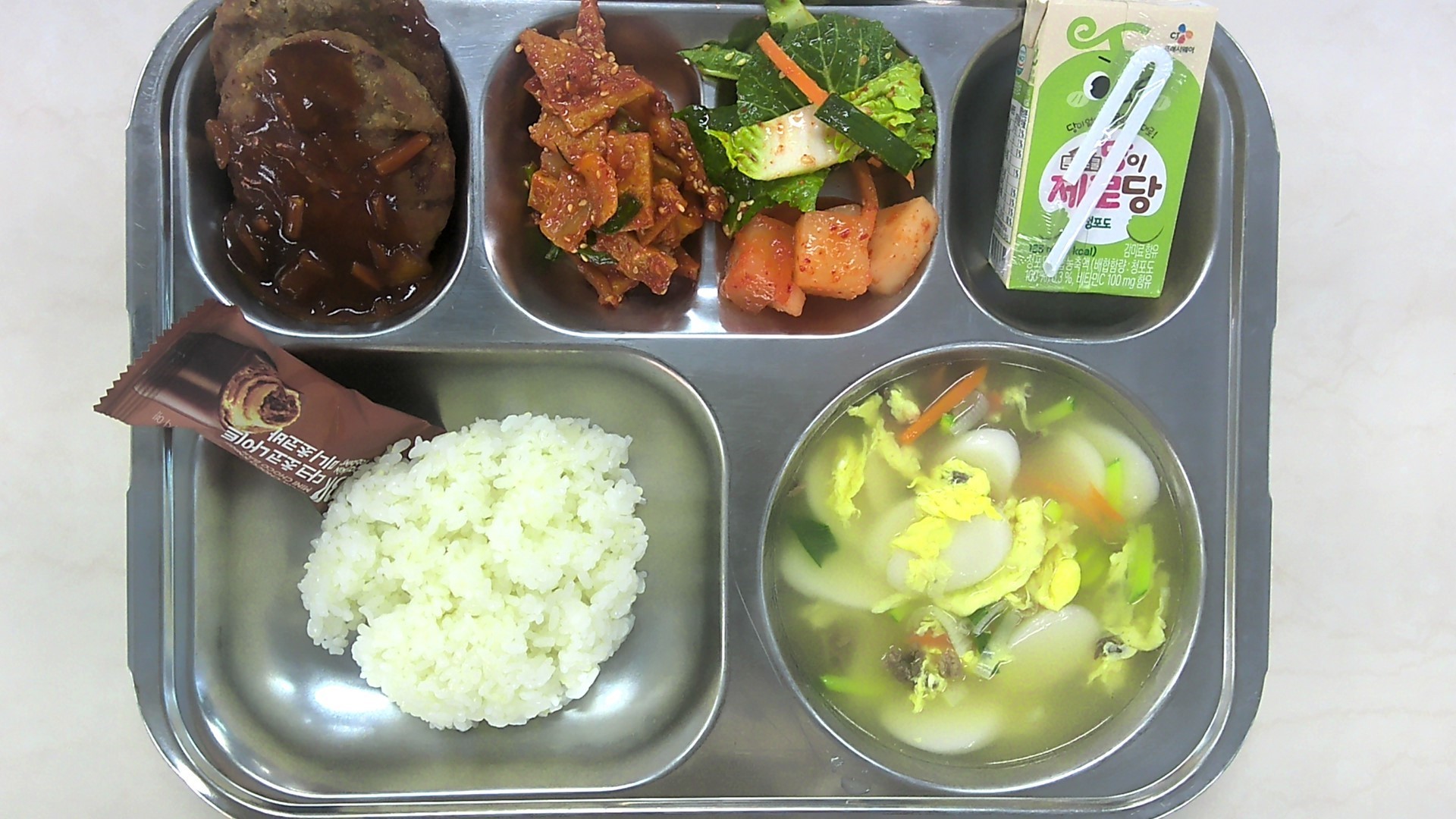 찹쌀밥(소)*중 떡국(주식) (1.16)봄동겉절이 충무식오징어무침 (1.5.6.13.17)함박스테이크 (1.2.5.6.10.12.15.16)깍두기(자율) (9)미니초코바 (1.2.5.6)청포도주스 (13)