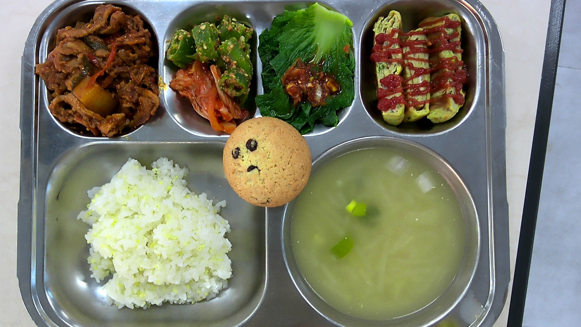 기장밥 들깨무채국* (5.6)아삭고추된장무침(중) (5.6)오리불고기*중 (5.6.13)채소달걀말이+케첩 (1.12)배추김치 (9)크림쿠키 (1.2.5.6)데친쌈추쌈(자율) (5.6)