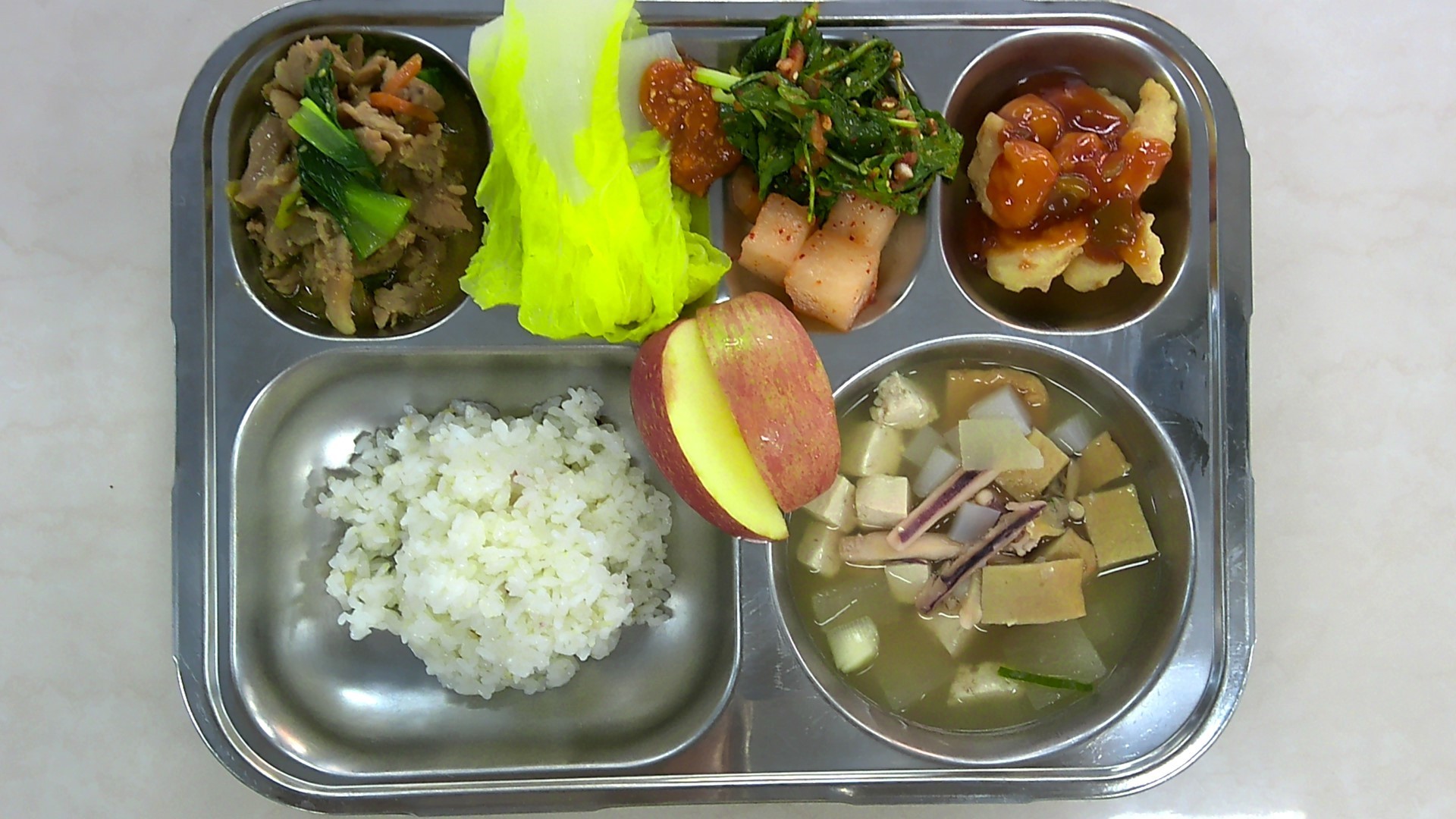 혼합잡곡밥 (5)두부탕국 (1.5.6.13.17.18)깐쇼새우 (1.5.6.9.12.13)알배추/쌈장-(자) (5.6.13)겨울초겉절이*(자율) (5.6.13)돼지청경채볶음 (5.6.10.13)깍두기 (9)사과(부사)*