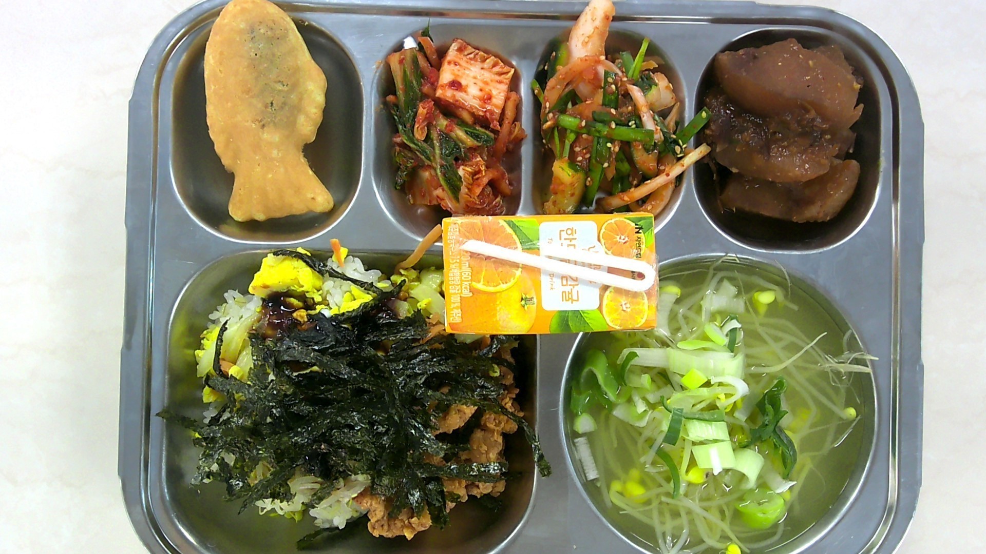 치킨마요덮밥* (1.5.6.13.15)맑은콩나물국*중 (5)건새우무조림(자율) (5.6.9.13)오이부추무침(자율) (13)배추김치 (9)주스(감귤) (13)반반붕어빵 (1.2.5.6)
