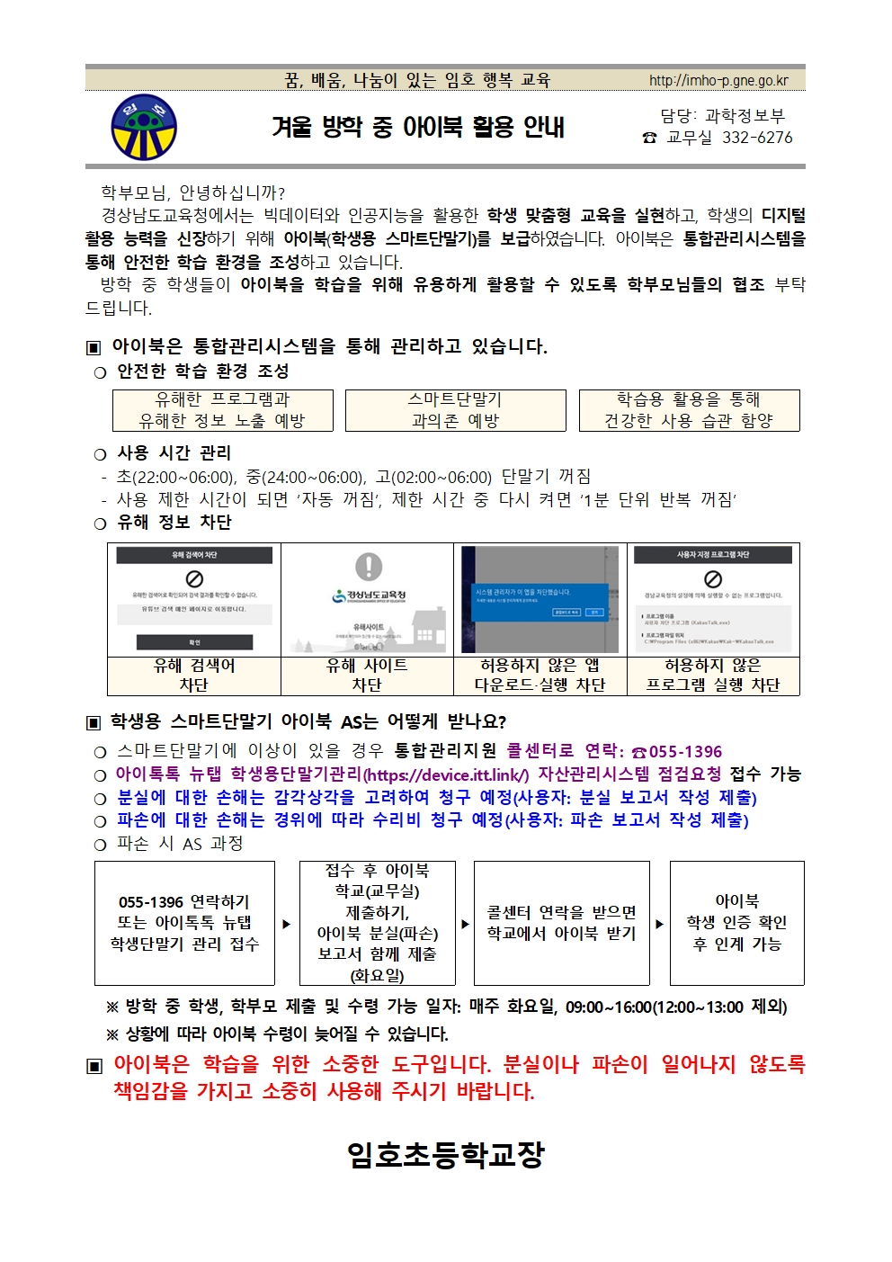 방학 중 학생들이 아이북을 학습을 위해 유용하게 활용할 수 있도록 학부모님들의 협조 부탁드립니다.