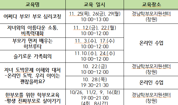 경남학부모지원센터에서는 학부모님들의 자녀양육에 도움을 드리고자 아래와 같이 학부모교육을 운영하오니 참여를 원하는 학부모님은 신청하시기 바랍니다.