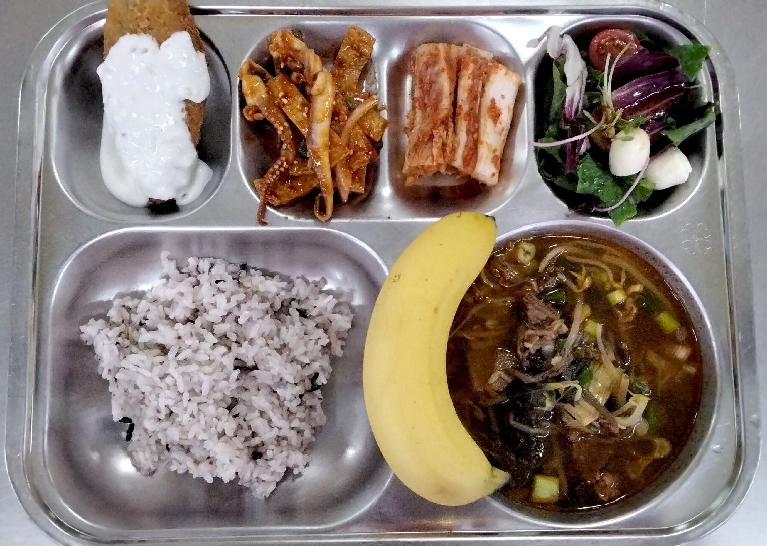 자율:토마토보코치니샐러드(1.2.5.6.12)배추김치(완)(9)바나나우유(2)* 에너지/단백질/칼슘/철548.1/23.0/295.9/1.4