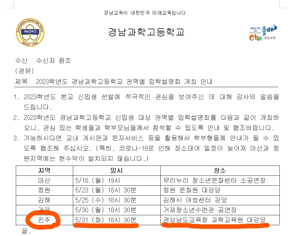 2023학년도 경남과학고등학교 권역별 입학설명회 개최 안내
