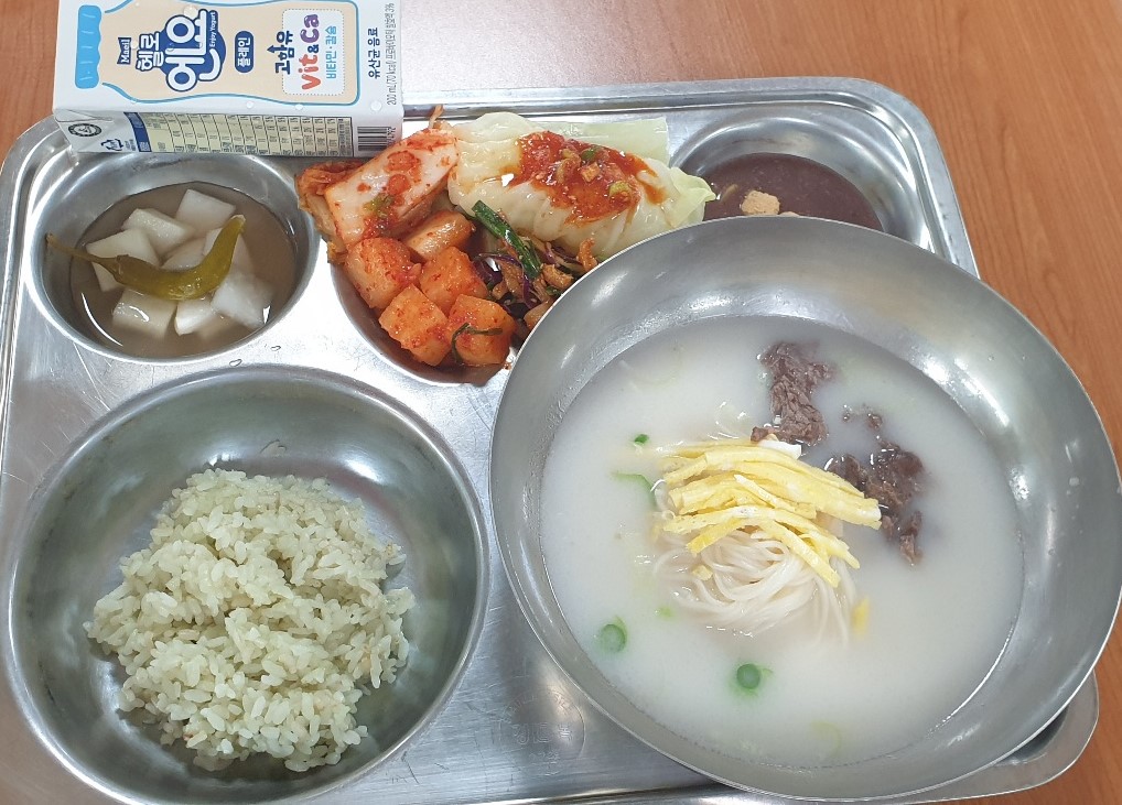 쌀밥(7분도미,친환경)단팥죽/콩고물(5.13)동치미김치(★)(9)설렁탕/국수사리(1.5.6.13.16)오징어채적양파무침(5.6.13.17)깍두기(9)배추김치★(9)요구르트(200엔요)(2)양배추쌈(★)828.2/37.5/289.6/5.0
