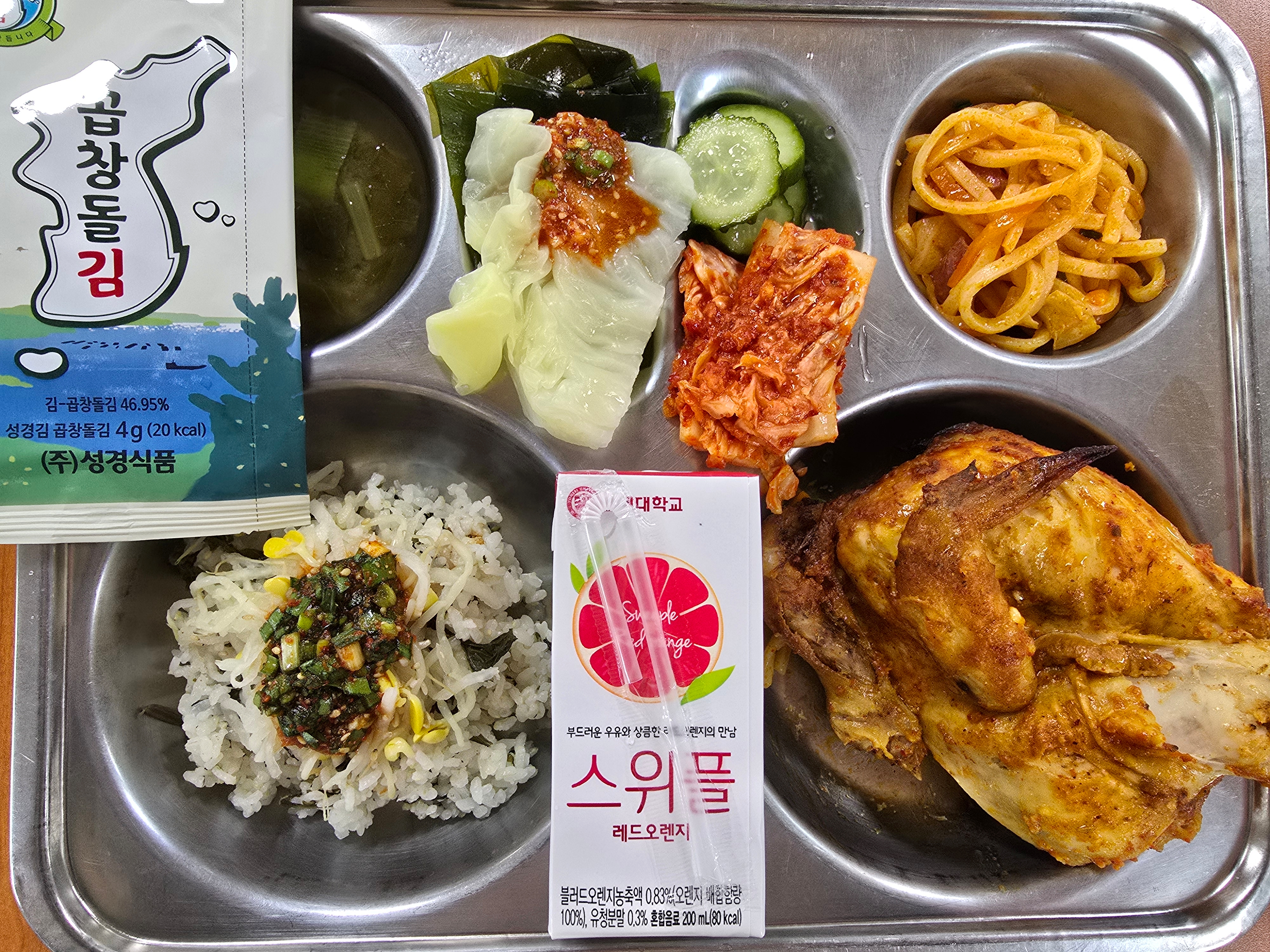곤드레밥/간장양념(5.6)베이컨볶음우동(해물소스) (5.6.10.13.16.18)열무된장국(★)(5.6.9.18)오이피클(13)닭반마리구이(오븐)/탄두리소스(2.5.6.12.13.15.16.18)배추김치(9)레드오렌지주스(13)양배추다시마/간장★)(13)1,005.6/53.0/233.9/4.6