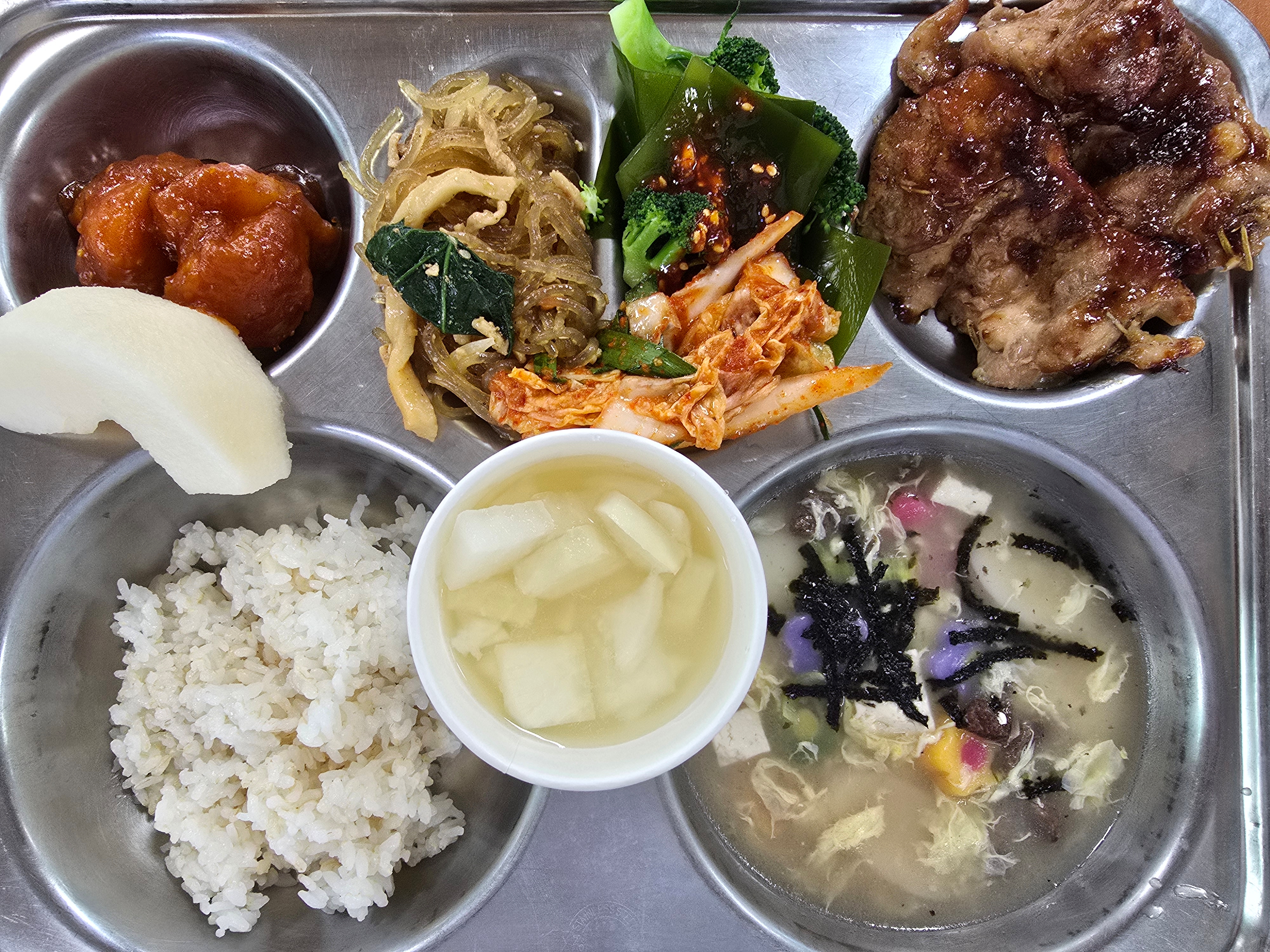 쌀밥(7분도미,친환경)쇠고기떡국(국)(1.5.9.16)알감자고추장조림(5.6.13)브로콜리다시마/초고추장(★)(5.6.13)잡채(시금치)(1.5.6.10.13)닭다리살스테이크(5.6.12.13.15.16.18)통배추겉절이(★)과일배(GAP)1,078.8/57.8/151.1/4.9