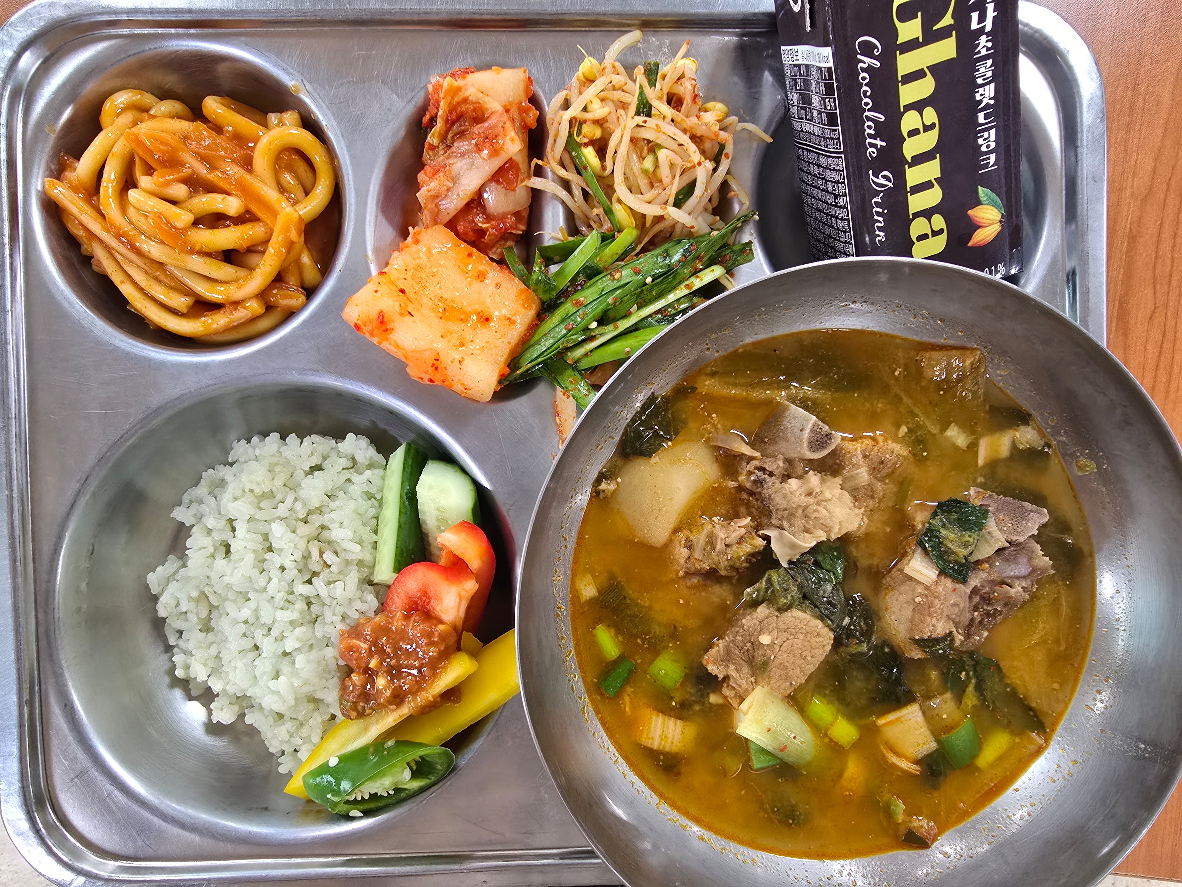 쌀밥(7분도미,친환경)돼지갈비감자탕(5.6.9.10)부추겉절이★(5.6.18)콩나물무침(5)우리밀떡볶음(1.5.6.13)나박깍두기(9)배추김치★(9)가나초콜릿우유(2)풋고추,오이,파프리카&쌈장★(5.6.13)858.4/30.6/501.0/4.3