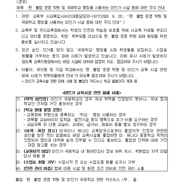 편,불법 운영 학원 및 국제학교 명칭을 사용하는 미인가 시설 등에 대한 주의 안내