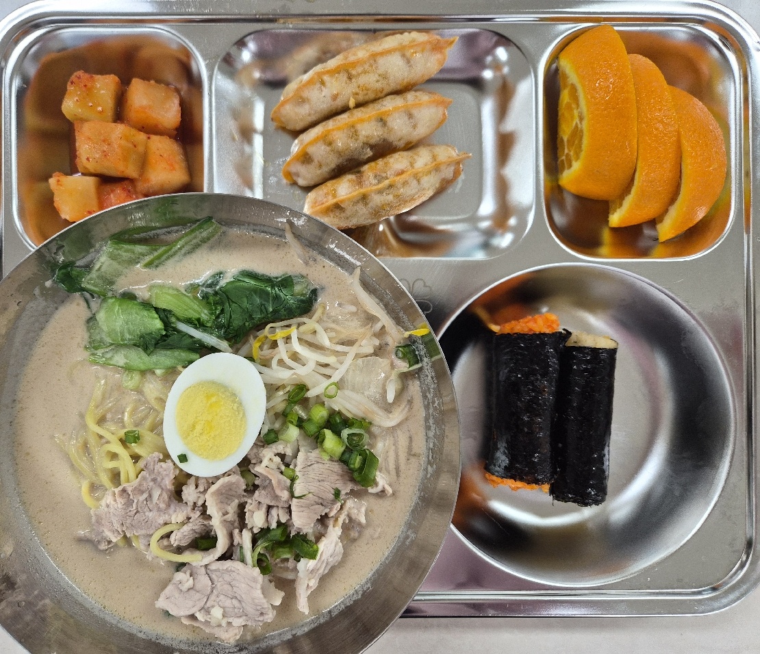 꼬마김밥(진미,참치마요)(1.2.5.6.10) 자율밥 돈코츠라멘(1.2.5.6.9.10.15.16.18) 짬뽕찐만두(1.5.6.9.10.15.16.17.18) 깍두기(9) 귤