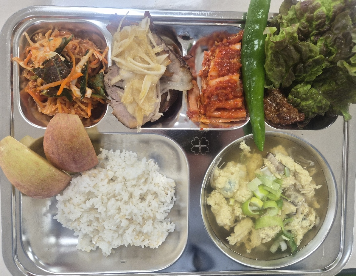 현미밥 버섯계란탕(1.8.9.18) 순살족발(10) *양파와사비무침(자율)(5.6.13) 한입쫄면야채무침(5.6.13) 배추김치(완제)(9) 사과(부사) 야채스틱/쌈장(마늘,아삭고추)(5.6)