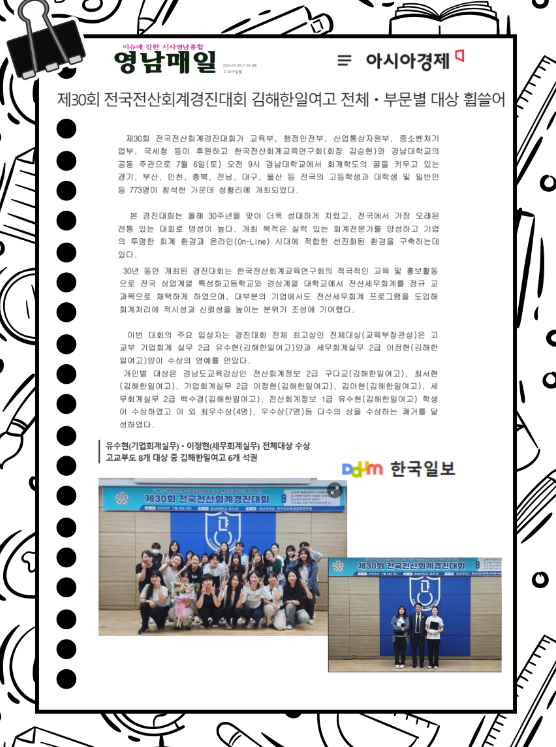 제30회 전국전산회계경진대회 김해한일여고 전체, 부문별 대상 휩쓸어(기사발췌)
