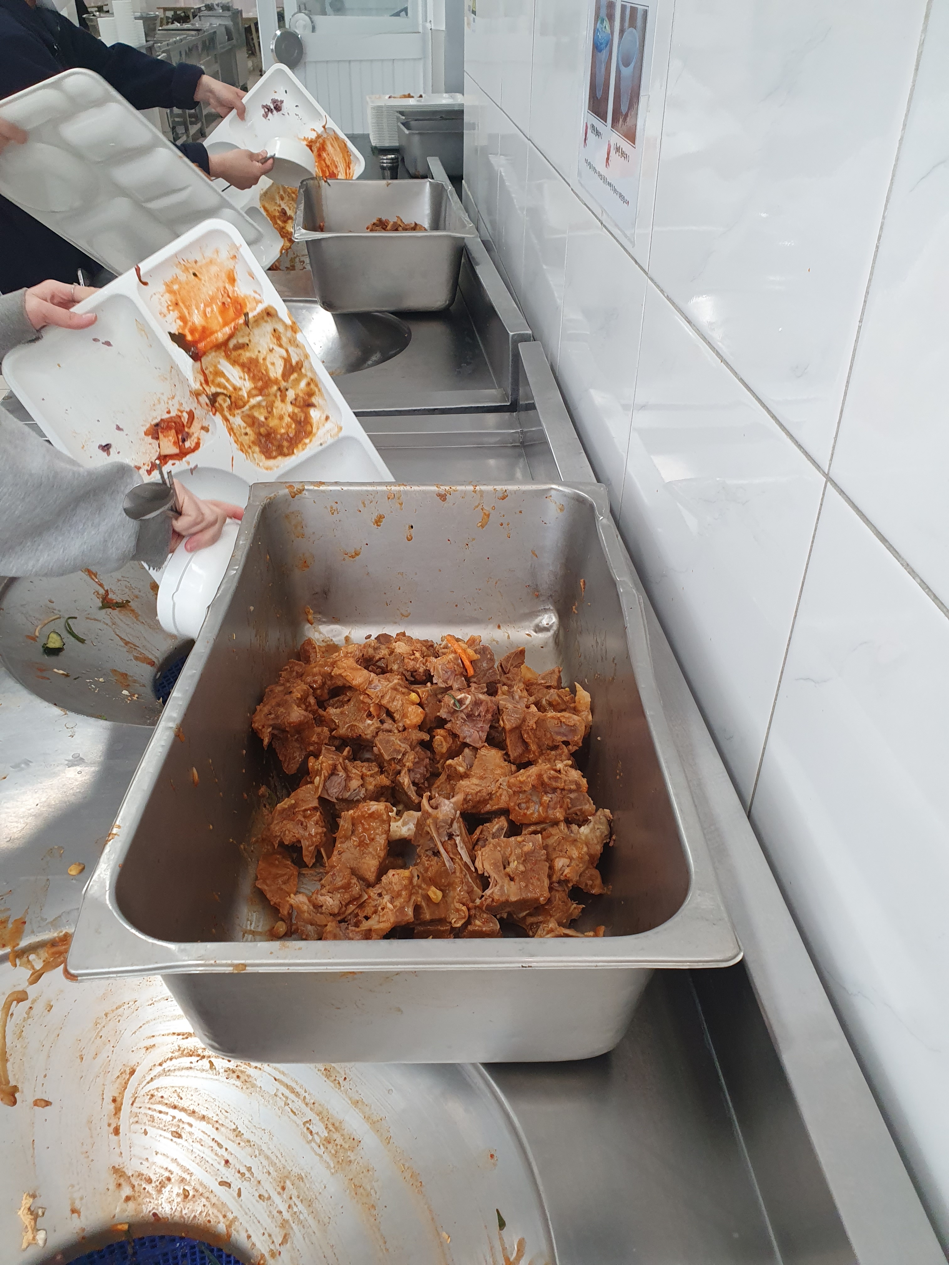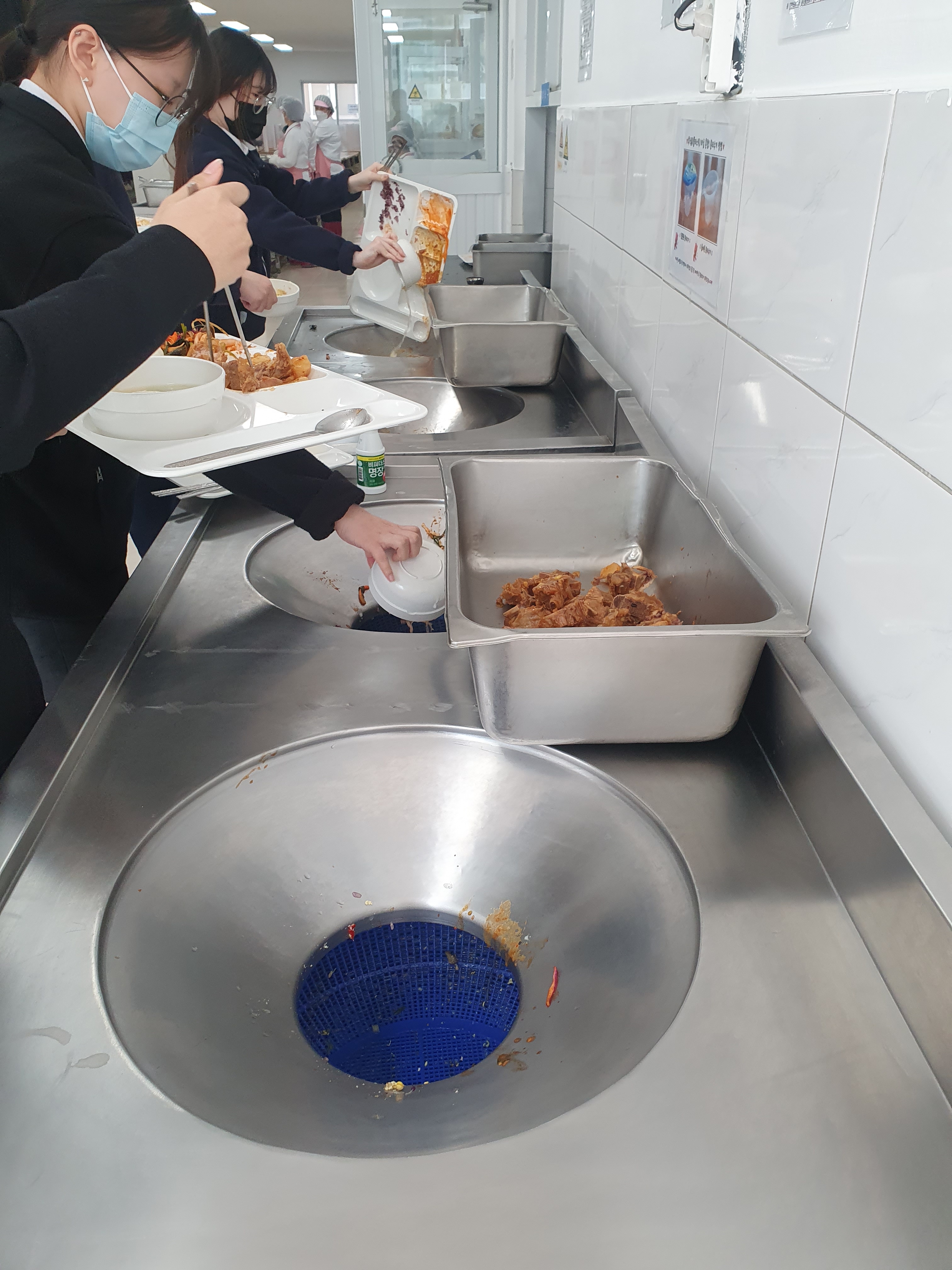 학생들이 음식물쓰레기와 일반쓰레기를 분리 배출 토록 현장 지도 (2021년 4월 20일 메뉴중 돼지등뼈의 음식물쓰레기와 일반쓰레기 분리 배출 지도)