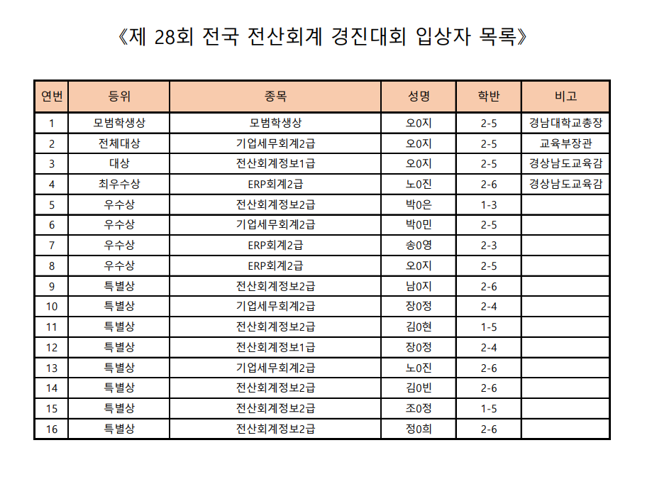 제 28회 전국 전산회계 경진대회 입상자