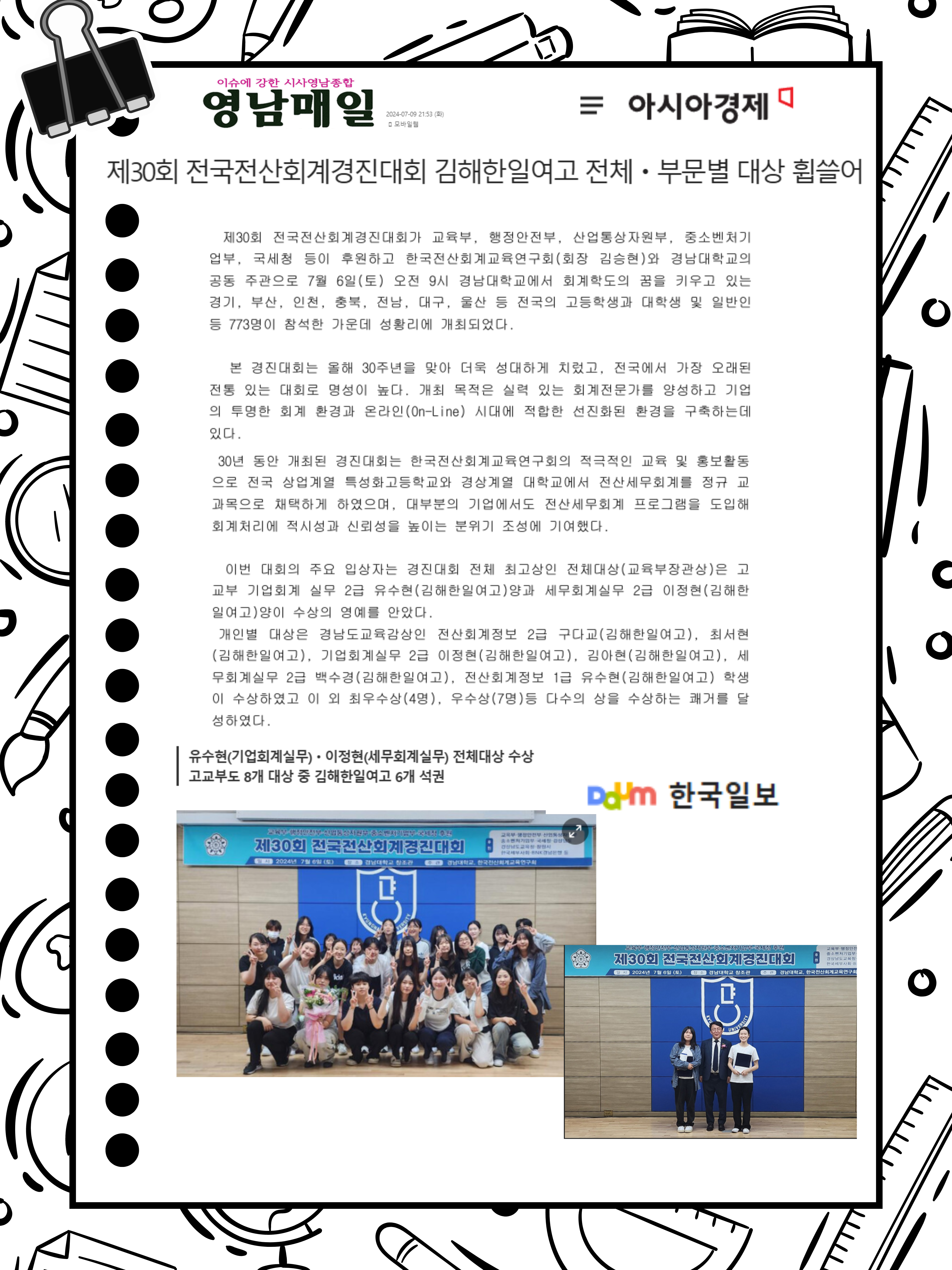 제30회 전국전산회계경진대회 김해한일여고 전체 부문별 대상을 수상했습니다! 아래 자료를 확인해 주세요