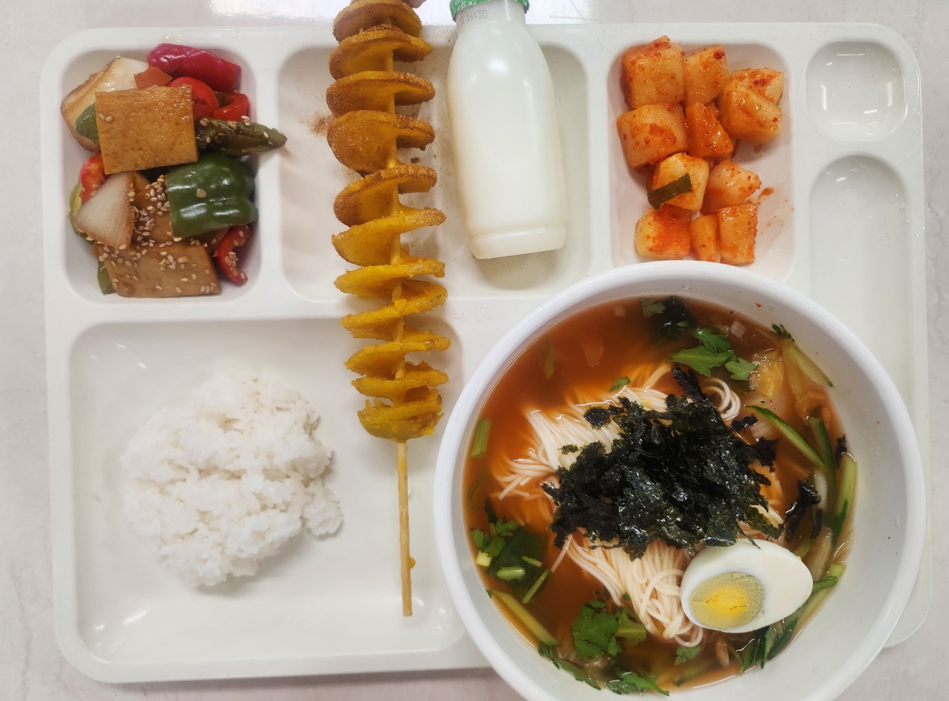 자율밥 김치말이국수22(1.5.6.9.16) 사각어묵볶음1(1.5.6.13) 회오리감자스/윗버터맛(5.6) 깍두기(9) 머스캣음료120ml