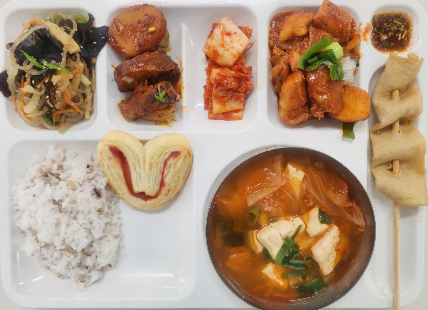 혼합잡곡밥(5) 참치김치찌개3(5.8.9.18) 코다리조림(5.6.13) 찐어묵+초간장(1.5.6.13) 한식잡채24(1.5.6.13.16) 닭볶음(5.6.13.15) 하트파이(1.2.5.6)