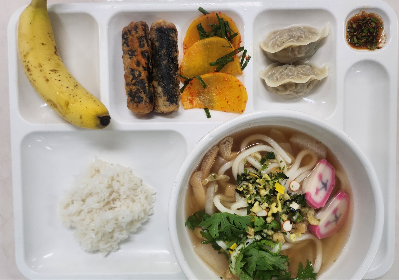 자율밥 우동(1.2.5.6.8.9.18) 마라맛김말이튀김(1.5.6.17.18) 단무지 바나나1/2 우리밀모닝빵+딸기잼(1.2.5.6.13)