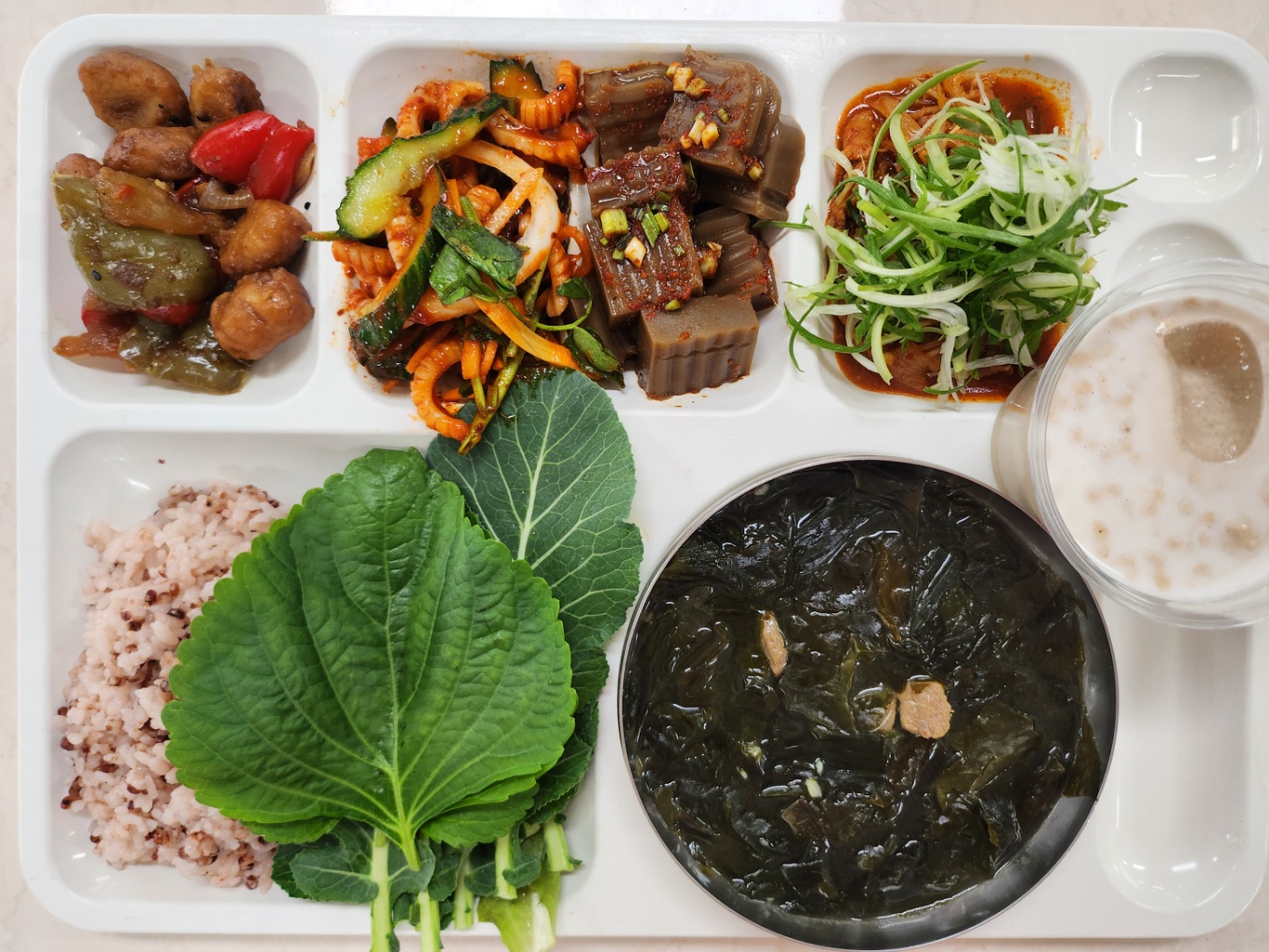 수수밥 한우미역국(5.6.8.9.16.18) 볼어묵볶음1(1.5.6.13) 오징어야채무침(5.6.13.17) 도토리묵+양념장(5.6.13) 파채불고기볶음+상추(5.6.10.13) 배추김치(완제)(9) 미숫가루21(2.5.13)