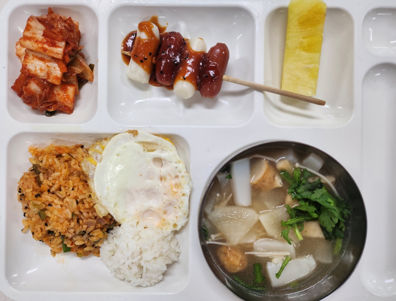 김치볶음밥(1.2.5.6.9.10.15.16) 쑥갓어묵국21(1.5.6.8.9.13.18) 달걀후라이 소떡소떡*소스(2.5.6.10.12.13.15.16) 배추김치(완제)(9) 파인애플60g