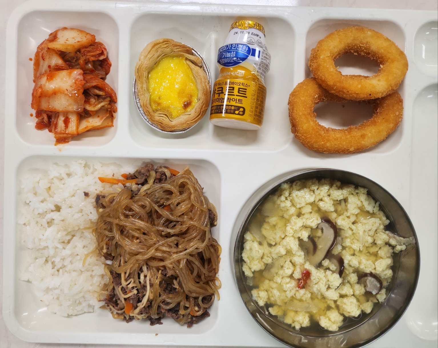 한우불고기덮밥(5.6.16) 계란국(표고,팽이)(1.8.9.18) 통살오징어링(1.5.6.17) 에그타르트(1.2.5.6) 배추김치(완제)(9) 야구르트100ml(저당)(2)