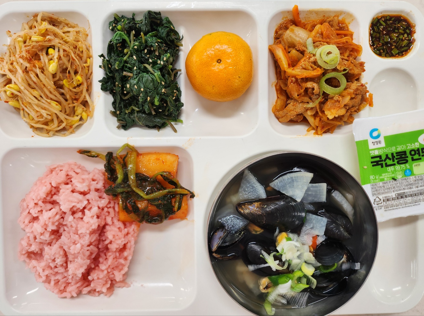 홍국쌀밥 시원칼칼한홍합탕(8.9.18) 연두부양념장(5.6) 깻잎순나물 매콤콩나물무침(5) 돈육김치불고기(5.6.9.10.13) 총각김치(9) 귤