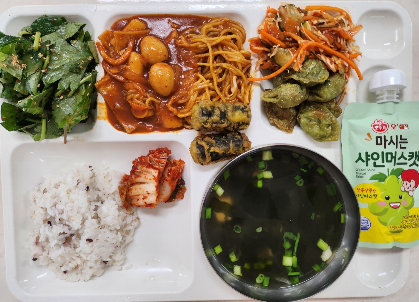 혼합잡곡밥(5) 미역장국(5.6.8.9.18) 참나물겉절이(13) 라볶이(1.5.6.13) 김말이튀김(1.5.6.10.16) 채식비빔만두(1.5.6.10.13.16.18) 배추김치(완제)(9) 포도맛음료110ml(13)