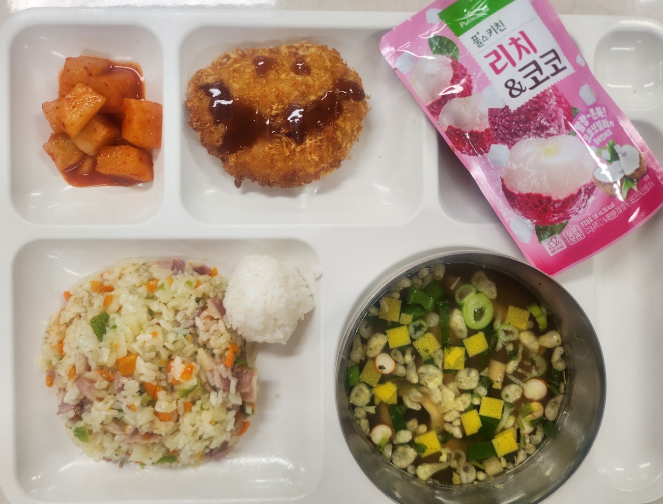 베이컨야채볶음밥1(5.6.10.13.18) 가쓰오유부장국1(1.2.5.6.7.8.9.13.18) 등심생가츠+소스(1.5.6.10.12.13.18) 깍두기(9) 리치코코음료100ml