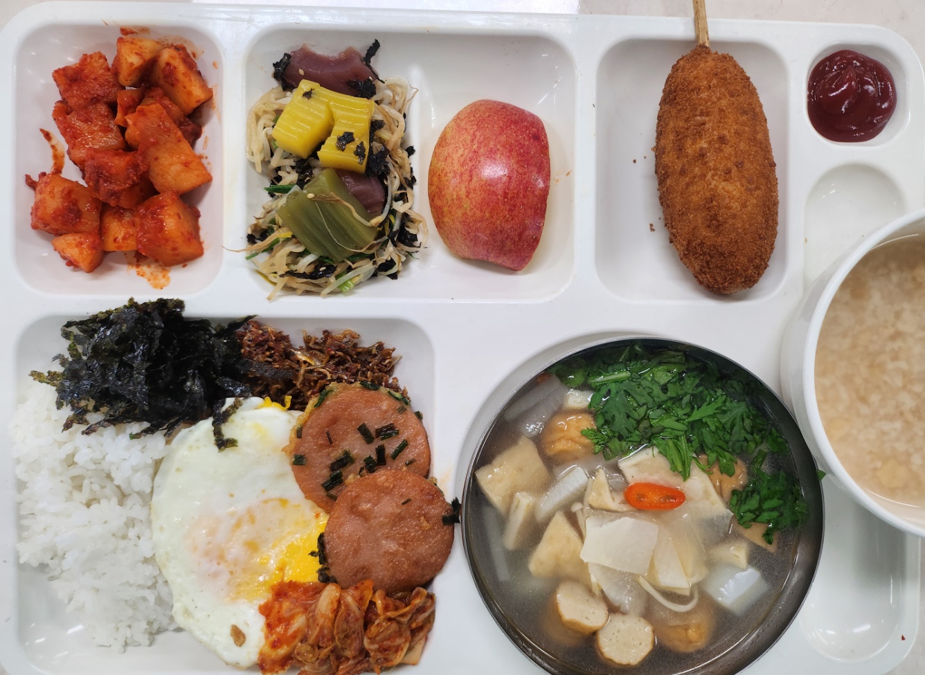 숭늉(자율) 추억의도시락비빔밥(1.2.5.6.9.10.15.16) 탱글뽀듯핫도그+케첩(1.2.5.6.10.12.15.18) 쑥갓어묵국21(1.5.6.8.9.13.18) 청포묵무침 깍두기(9) 사과(부사)