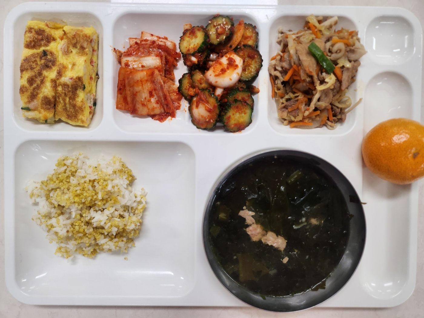 기장밥 한우미역국(5.6.8.9.16.18) 오이생채(13) 돈간장불고기(5.6.10) 계란말이1(1.5.6.8) 배추김치(완제)(9) 귤