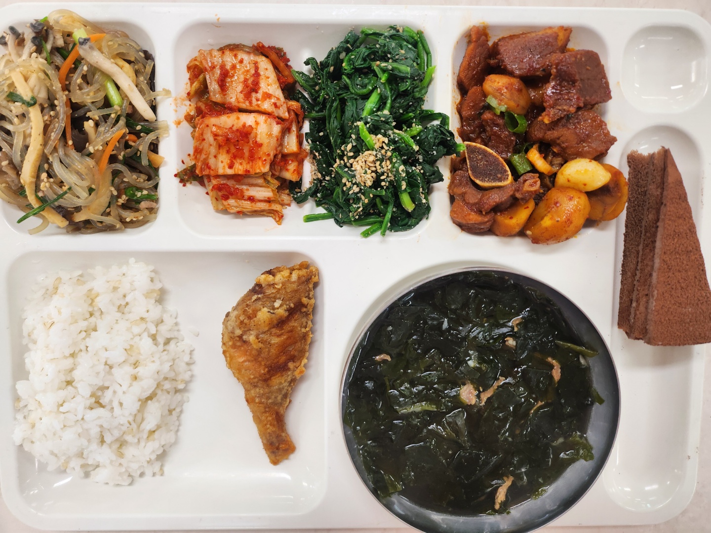 현미밥 한우미역국(5.6.8.9.16.18) 매콤돼지갈비찜1(5.6.10.13) 시금치나물 한식잡채24(1.5.6.10.13) *적어구이(자율) 배추김치(완제)(9) 수제가나초코케이크(1.2.5.6