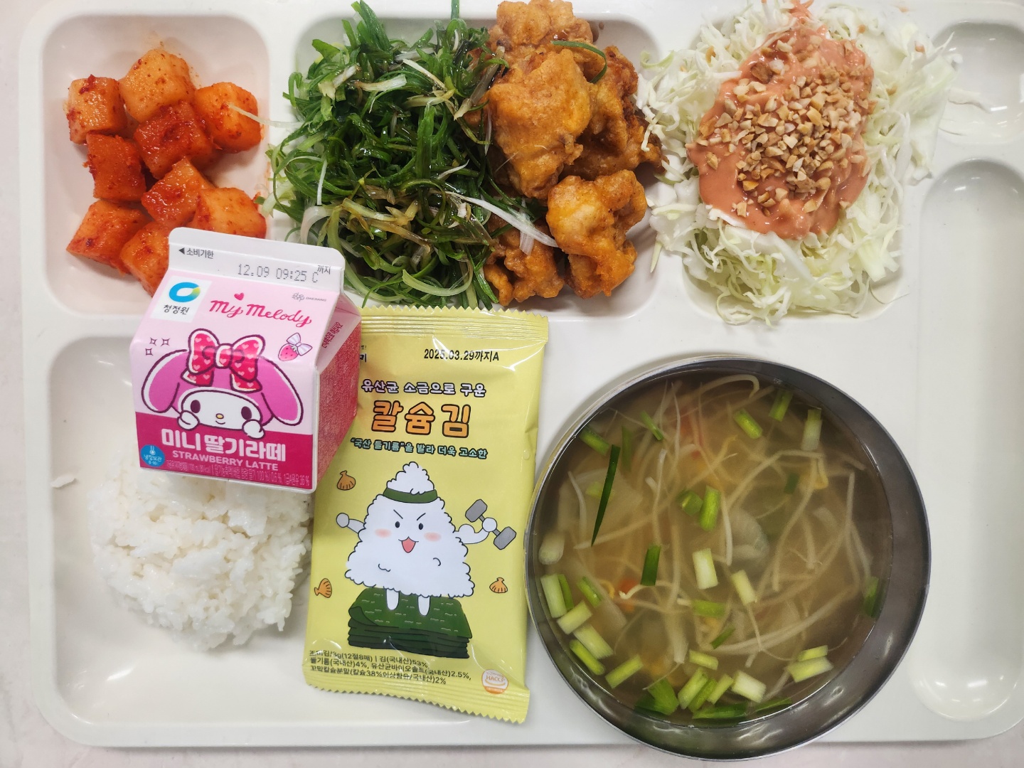 찹쌀밥 친환경콩나물국1(5.6.8.9.18) 옛날식양배추샐러드(1.4.5.12) 순살파닭(5.6.13.15) 맛김 깍두기(9) 딸기우유(13)