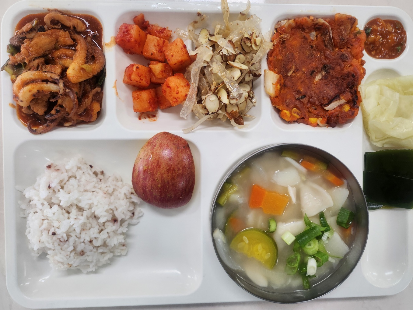 수수밥 감자수제비국(5.6.8.9.18) 양배추,다시마쌈(자율)+쌈장(5.6) 불향주꾸미불고기(5.6.10) 명엽채볶음1(5.6) 옥수수김치전(5.6.9) 깍두기(9) 사과(부사)