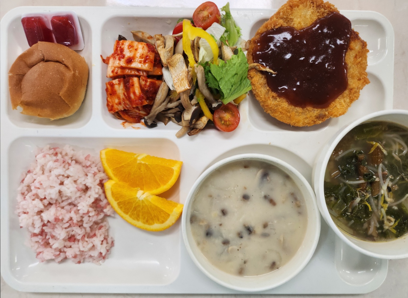 홍국쌀밥 머쉬룸크림스프(2.5.6.13.16) *추어탕(자율)(5.6) 구운버섯샐러드+발사믹드레싱(1.2.5.6.12) 경양식왕돈까스135g(1.5.6.10.12.13.18) 배추김치(완제)(9) 오렌지1 우리밀모닝빵+딸기잼(1.2.5.6.13)