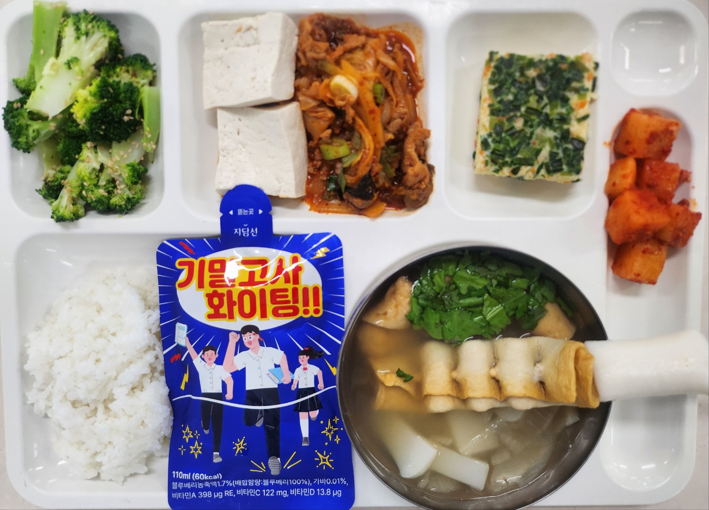 가바찹쌀밥 모듬쑥갓어묵국(1.5.6.8.9.13.18) 맛살야채계란찜1(1.5.6.8) *브로콜리무침 두부/김치볶음(5.9.10.13) 깍두기(9) 비타민쥬스110ml파우치