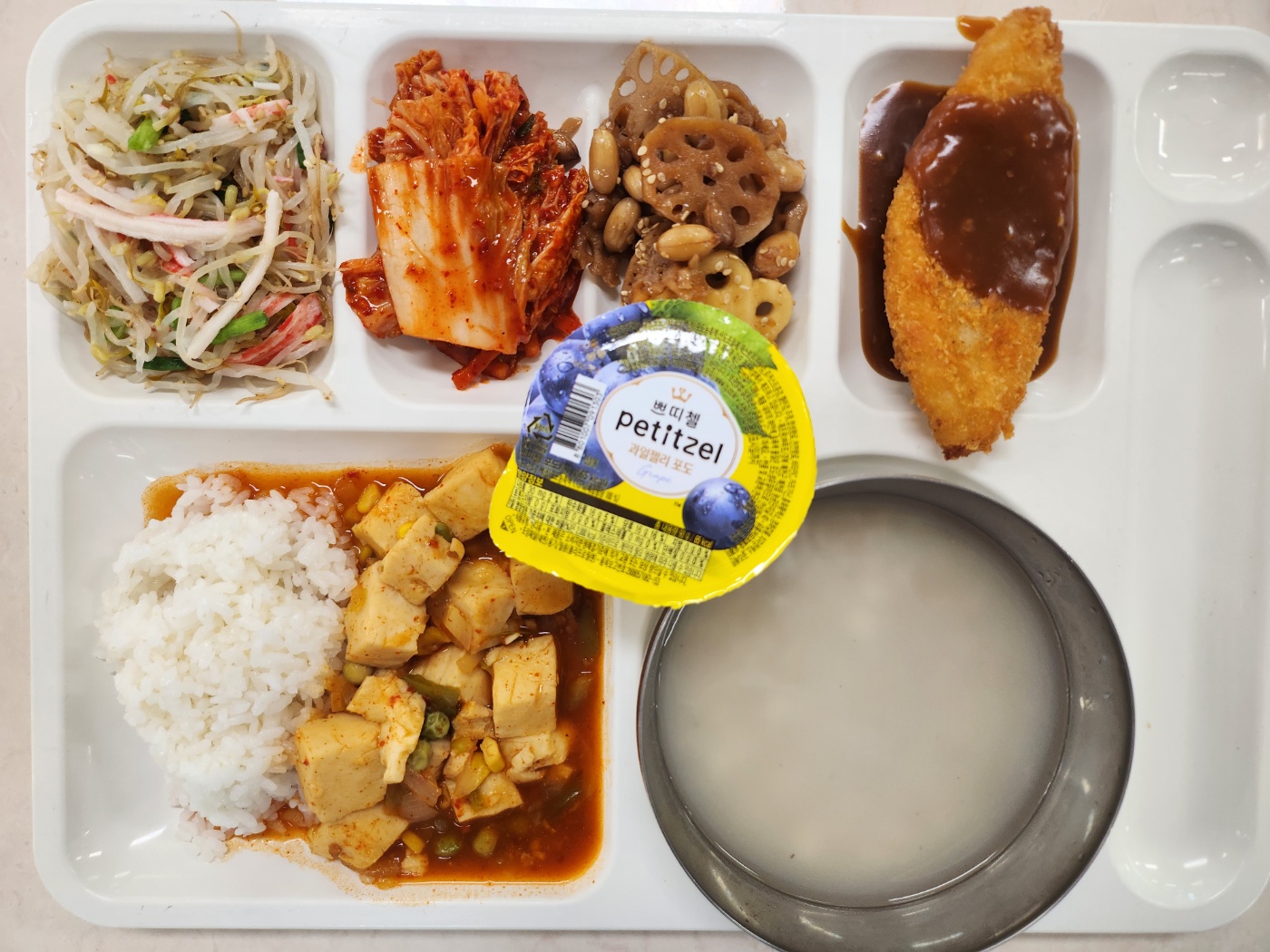마파두부덮밥(5.6.10.12.13.18) 케이준대구까스+바베큐소스(1.5.6.12.13) 배추김치(완제)(9) 포도맛푸딩젤리(2)