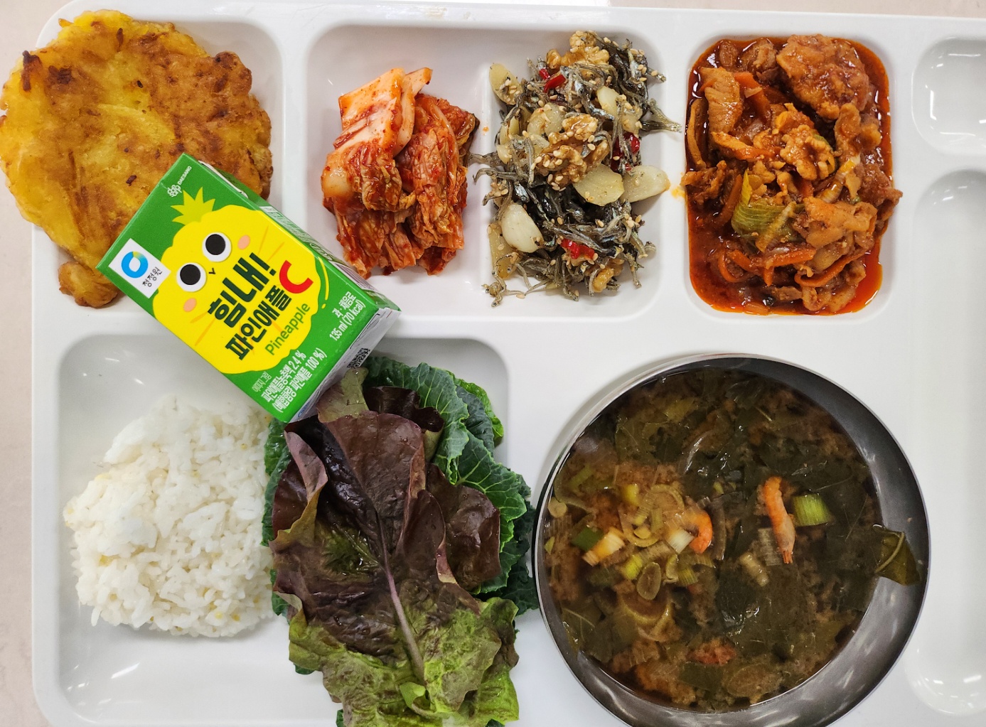기장밥 건새우아욱국1(5.6.8.9.18) 견과류멸치볶음1(13.14) 제육불고기(5.6.10.13) 호박전(5.6) 배추김치(완제)(9) *모듬쌈(깻,케,당,상)(자율) 파인애플주스(힘내)135ml(13)