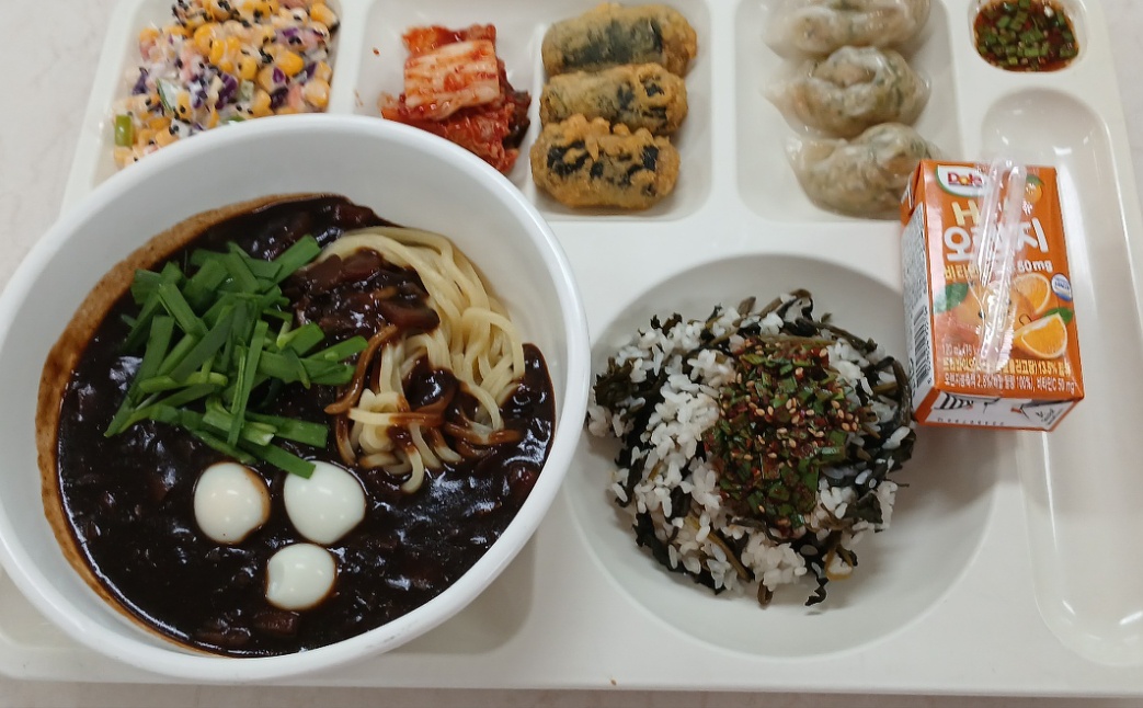 자장면1(1.5.6.10.13.16) 속보이는고기만두+간장(1.5.6.10.13.16.18) 옥수수콘샐러드1(1.5.13) 김말이튀김(1.5.6.10.16) 배추김치(완제)(9) 오렌지맛주스(돌)120ml