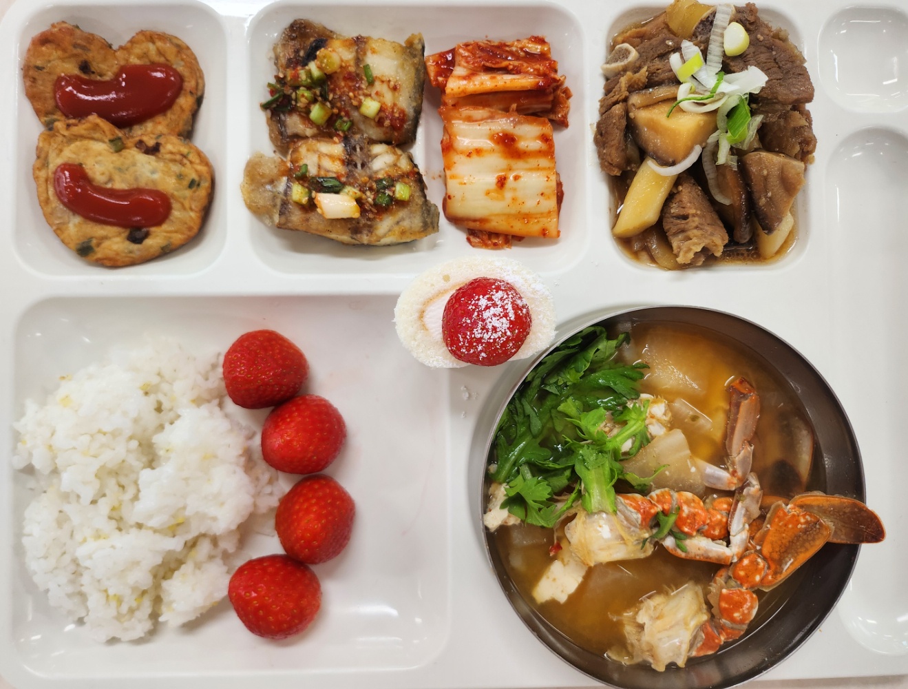 기장밥 꽃게된장국1(5.6.8.9.18) 삼치구이*양념장(자율)(5.6) 돼지갈비떡찜(5.6.10.13) 하트어묵전+케첩(1.5.6.12) 배추김치(완제)(9)\소금맛롤케이크1.2.5.6 딸기(설향)지원센터