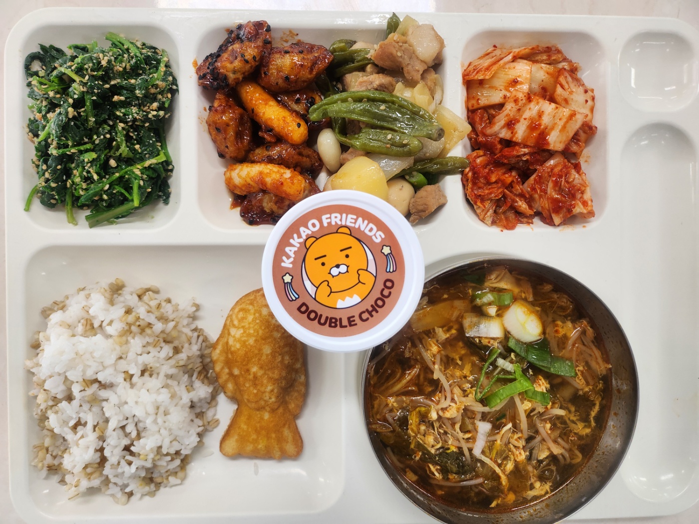 보리밥 육개장(1.8.9.16.18) 돈육장조림(1.5.6.10.13) 취나물된장무침(5.6) 만두떡강정(1.2.5.6.10.12.13.16.18) 팥슈반반붕어빵(1.2.5.6