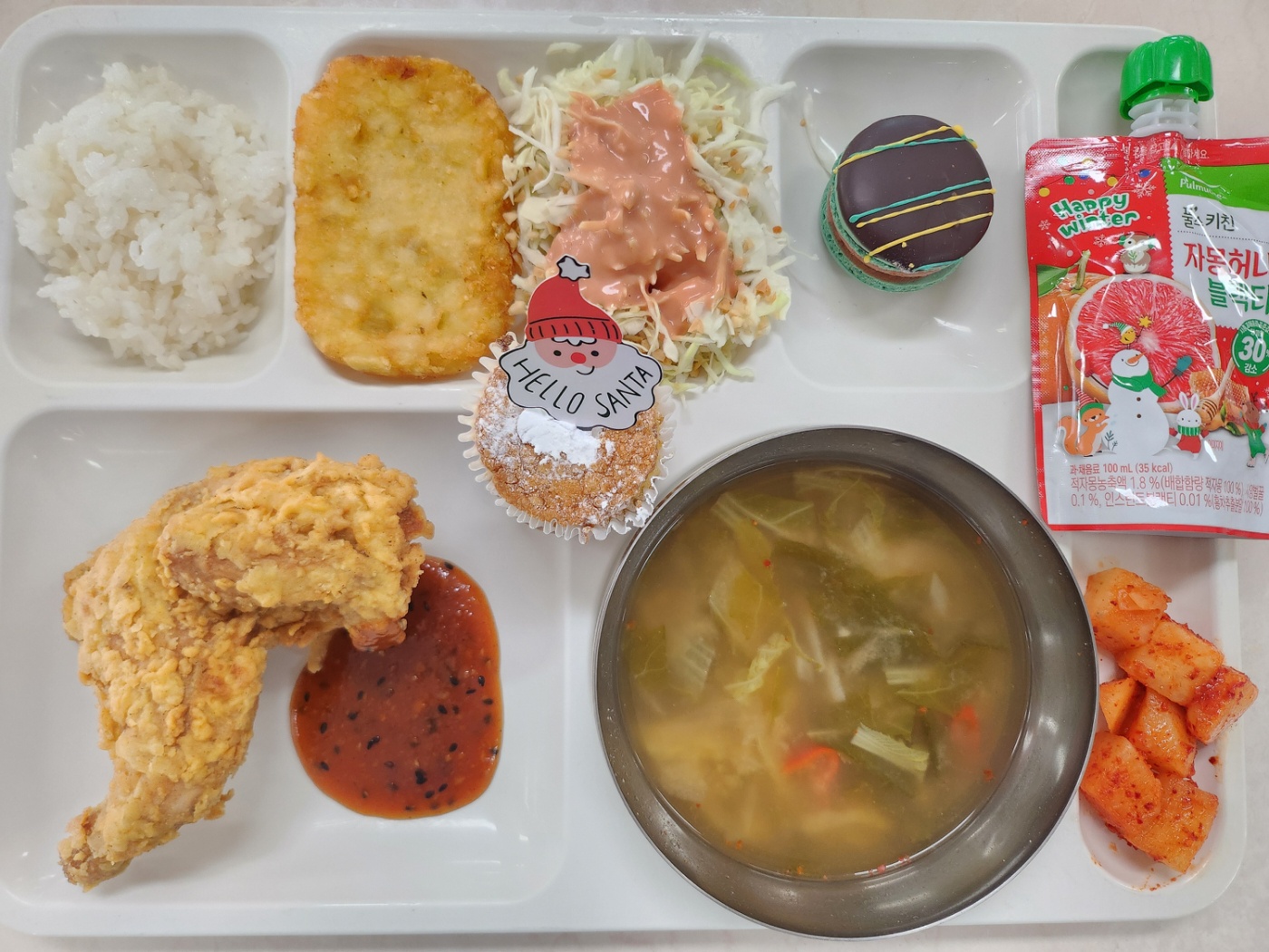 옛날식양배추샐러드(1.4.5.12) 해쉬브라운(5.6) 옛날통닭반마리(15) 깍두기(9) 자몽허니블랙티/음료(13)두바이마카롱1.2.6 소보루케이크(크리스마스)(1.2.5.6)