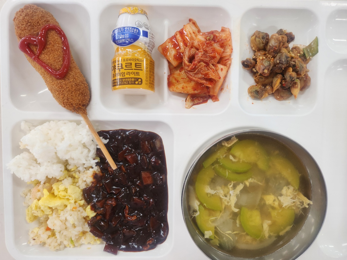 자율밥 야채새우볶음밥(9.10.13) 자장소스(짜장소스)(5.6.10.13.16) 꼬물이만두국(1.5.6.8.9.10.16.18) *꼬막무침(자율무침)(5.6.13.18) 페퍼로니치즈핫도그80g(1.2.5.6.10.12.15.18) 배추김치(완제)(9) 야구르트100ml(저당)(2)
