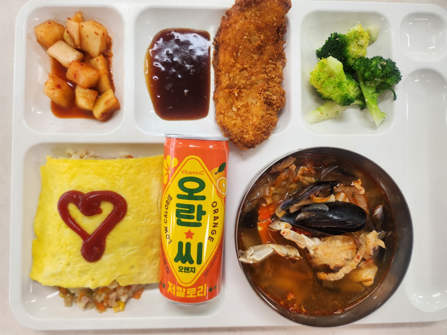 오므라이스+케첩24(1.2.5.6.10.12.13.15.16.18) 해물짬뽕탕(당면)(5.6.8.9.10.13.17.18) *브로콜리무침 수제치킨가스100g(1.2.5.6.12.13.15.18) 깍두기(9) 저칼로리음료(오란c)