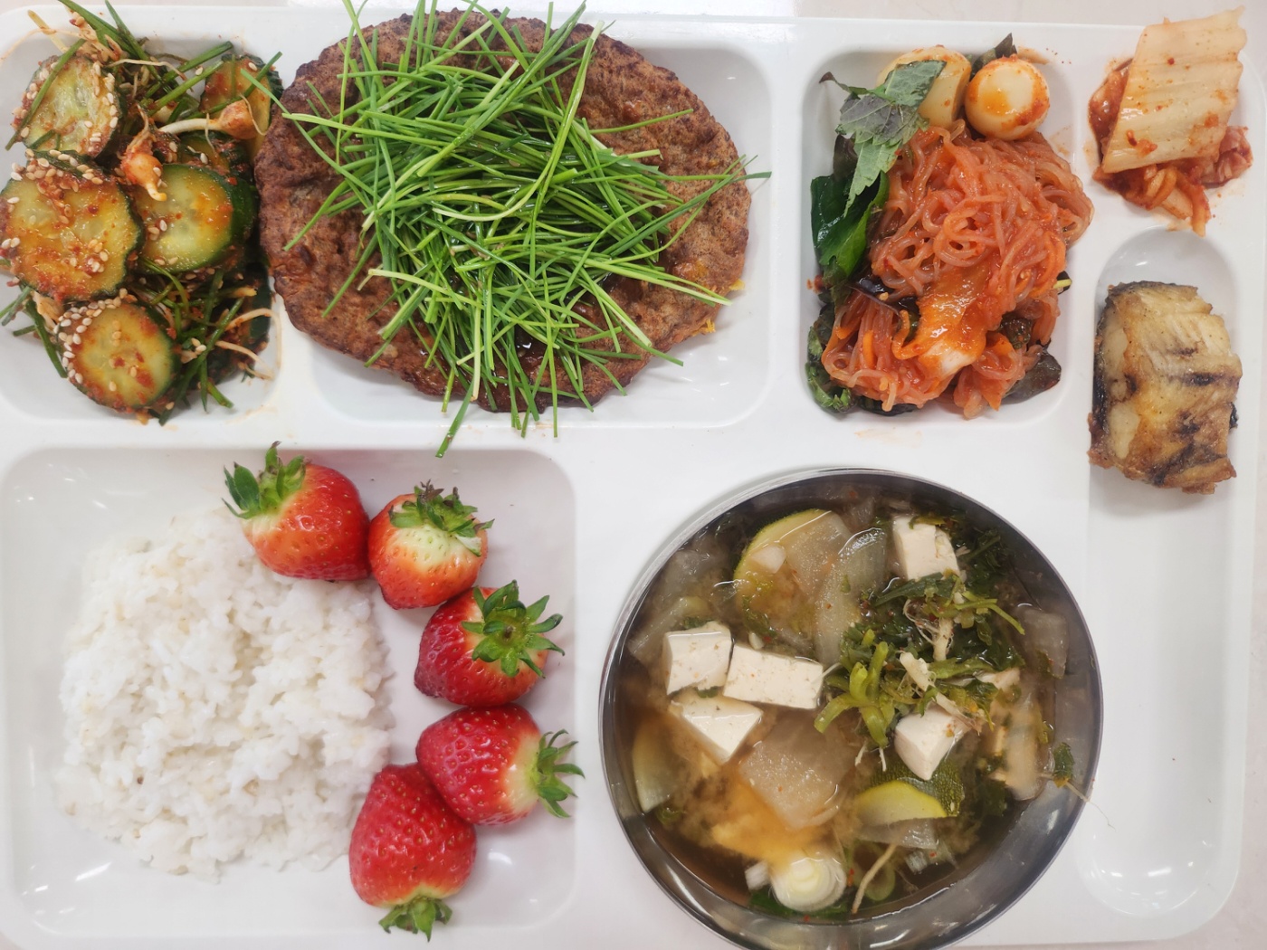 현미밥 냉이된장국1(5.6.8.9.18) 실곤약메추리알무침(1.5.6.13) 달래오이무침(13) 치즈품은언양식납작불고기+파채무침(2.5.6.16) *임연수어구이1자율(5.6) 배추김치(완제)(9) 딸기