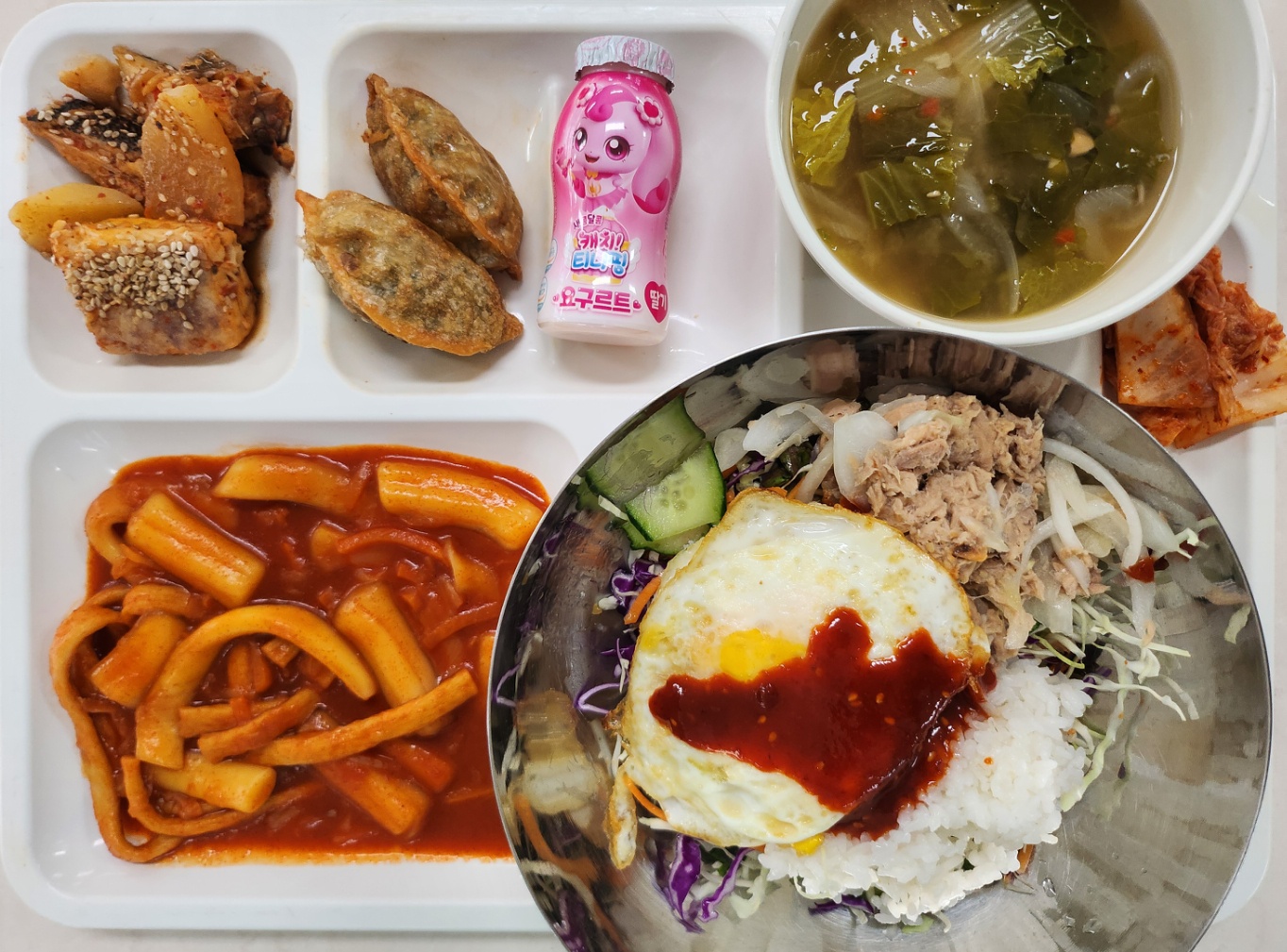 참치비빔밥1(1.5.6.13) 시락국*자율(5.6.8.9.18) 가자미조림(자율)(5.6.13) 후루룩국물떡볶이(1.2.5.6.13) 부추당면왕교자만두(1.5.6.10.16.18) 배추김치(완제)(9) 딸기맛야구르트80ml(티니핑)(2)
