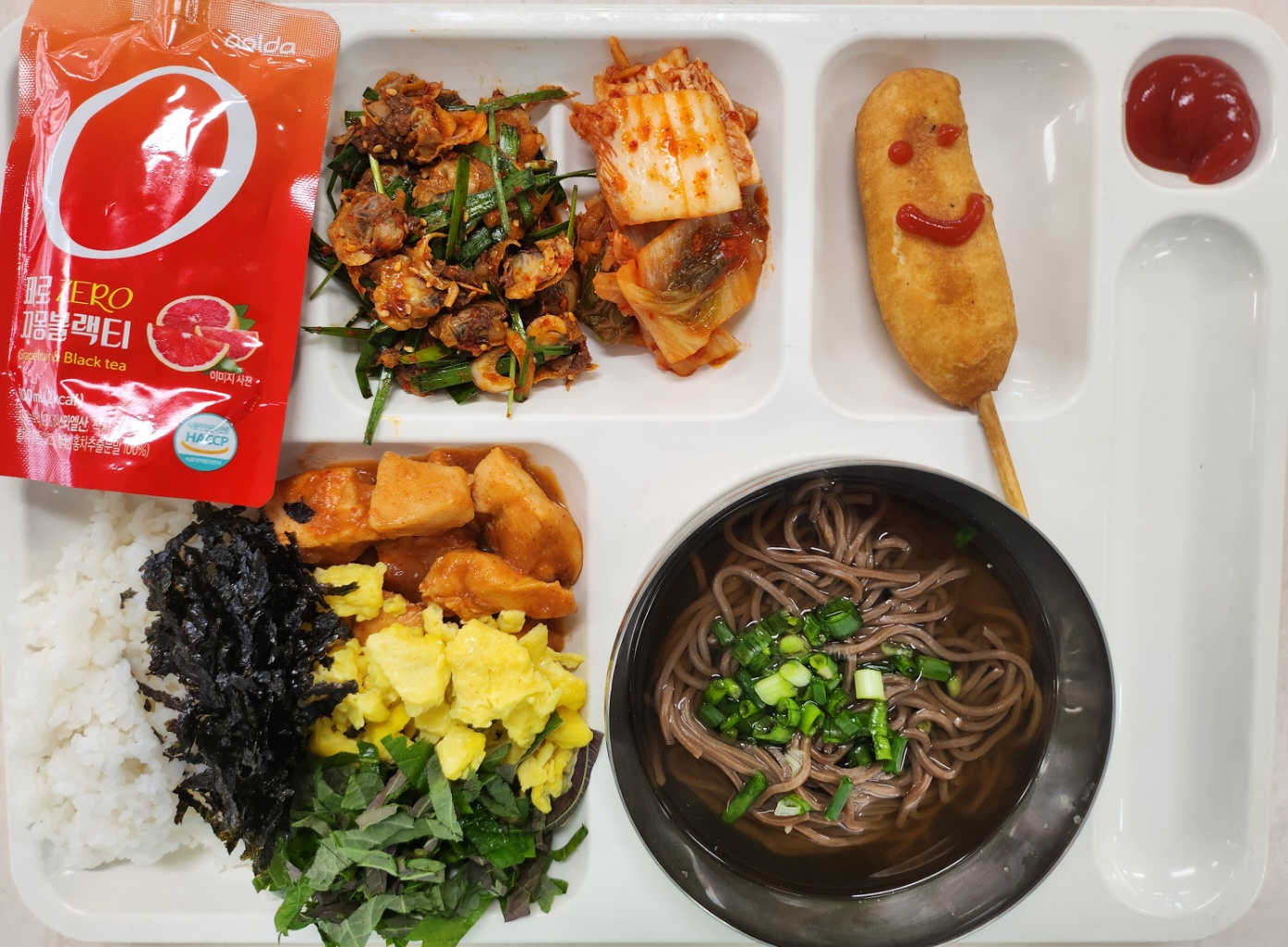 저당양념치킨덮밥25(1.5.6.15) 온메밀소바(미니)(3.5.6.8.9.13.18) 고구마핫도그(1.2.5.6.10.12.15.16.18) 배추김치(완제)(9) 제로자몽블랙티(13)