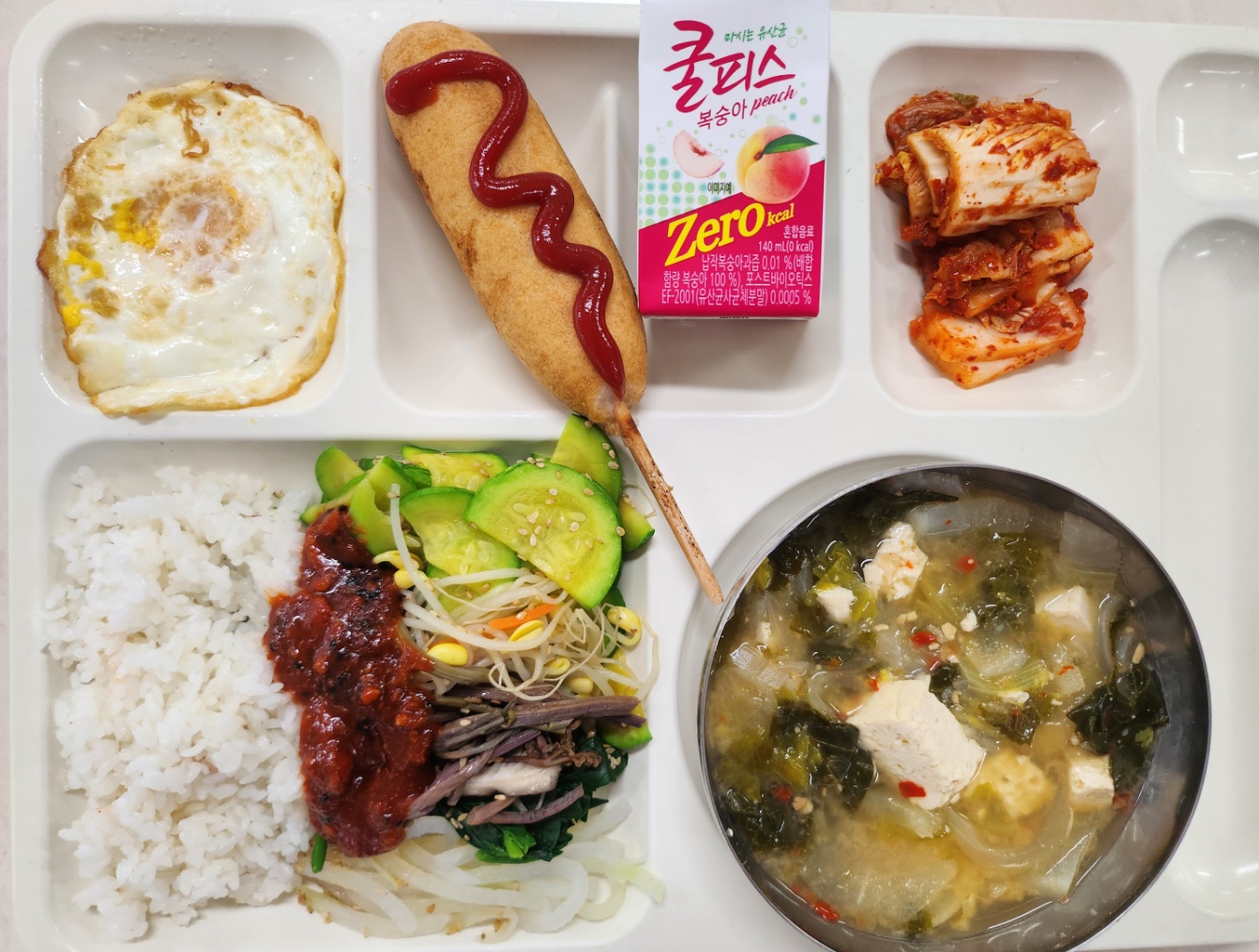 나물비빔밥+고추장(5.6.10) 두부된장국(5.6.8.9.18) 왕핫도그+케첩(1.2.5.6.10.12.15.18) 계란후라이(친환경)(1) 배추김치(완제)(9) 레드자몽쥬스100ml(13)