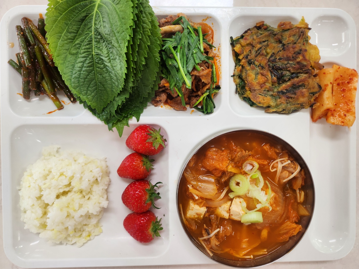 강황찹쌀밥 참치김치찌개3(5.8.9.18) 마늘쫑고추장(5.6.13) 오리불고기(5.6.13) 부추전(5.6.17.18) 총각김치(9) 딸기 깻잎쌈