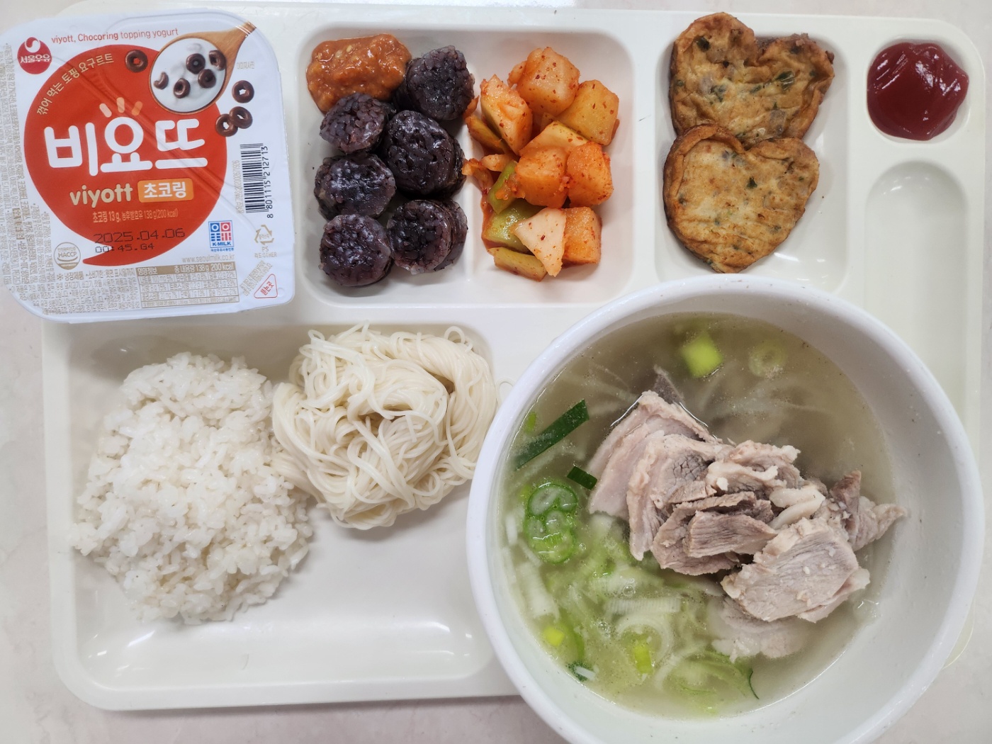 백미밥 돼지국밥+순대+소면사리(2.5.6.9.10.13.16) 하트어묵전+케첩(1.5.6.12) 깍두기(9) 초코링요거트(비요뜨)(2)