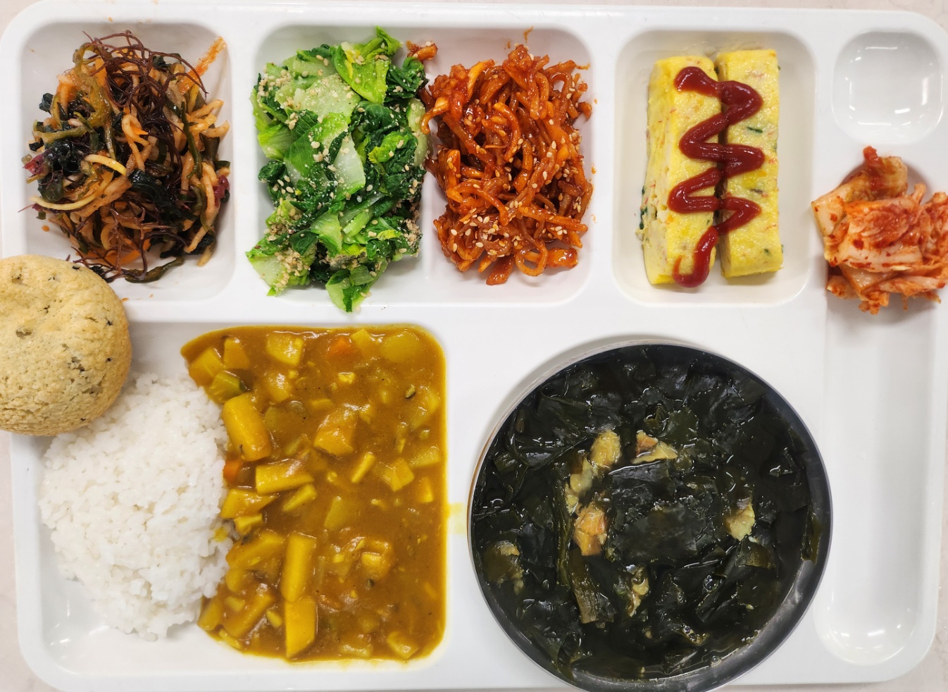 사과카레라이스(채식)(2.5.6.12.13.16) 북어포미역국(5.6.8.9.18) *모듬해초무침(자율)(5.6.13) 단배추나물(13) 일미채무침1(5.6.13.17) 계란말이+케첩(1.5.6.8.12.18) 찰보루빵40g(1.2.5.6) 배추김치(완제)(9)